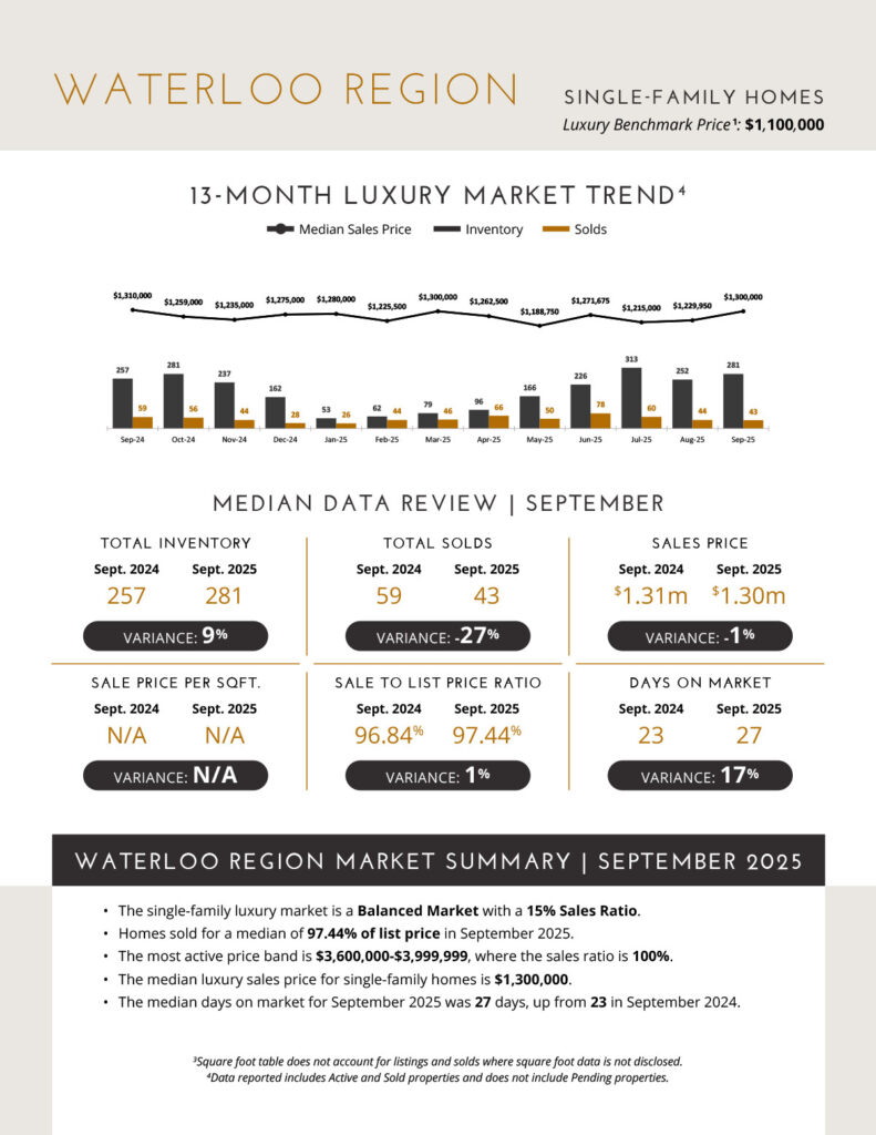 The single-family luxury market in Waterloo Region is classified as balanced, with a 15% sales ratio, meaning that neither buyers nor sellers hold a dominant position.