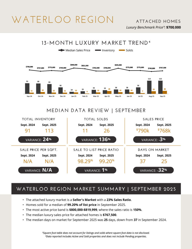 This segment is showing resilience. The sharp year-over-year rise in sales, shorter marketing times, and higher sale-to-list ratios all point to strong buyer engagement. Many of these buyers are professionals, downsizers, or investors seeking low-maintenance luxury close to Waterloo’s key employment hubs, universities, and transit access.