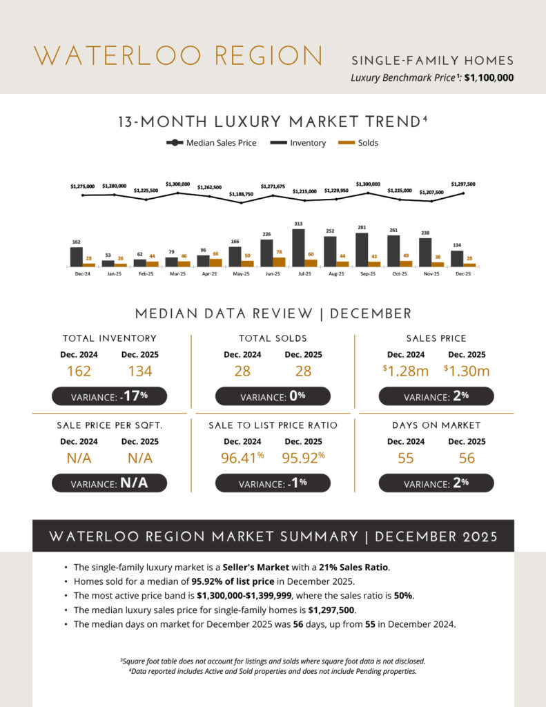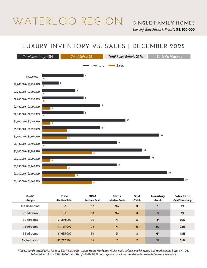 Waterloo Region’s single-family luxury market closed December in seller-favoured territory, supported by strong absorption and stable pricing.