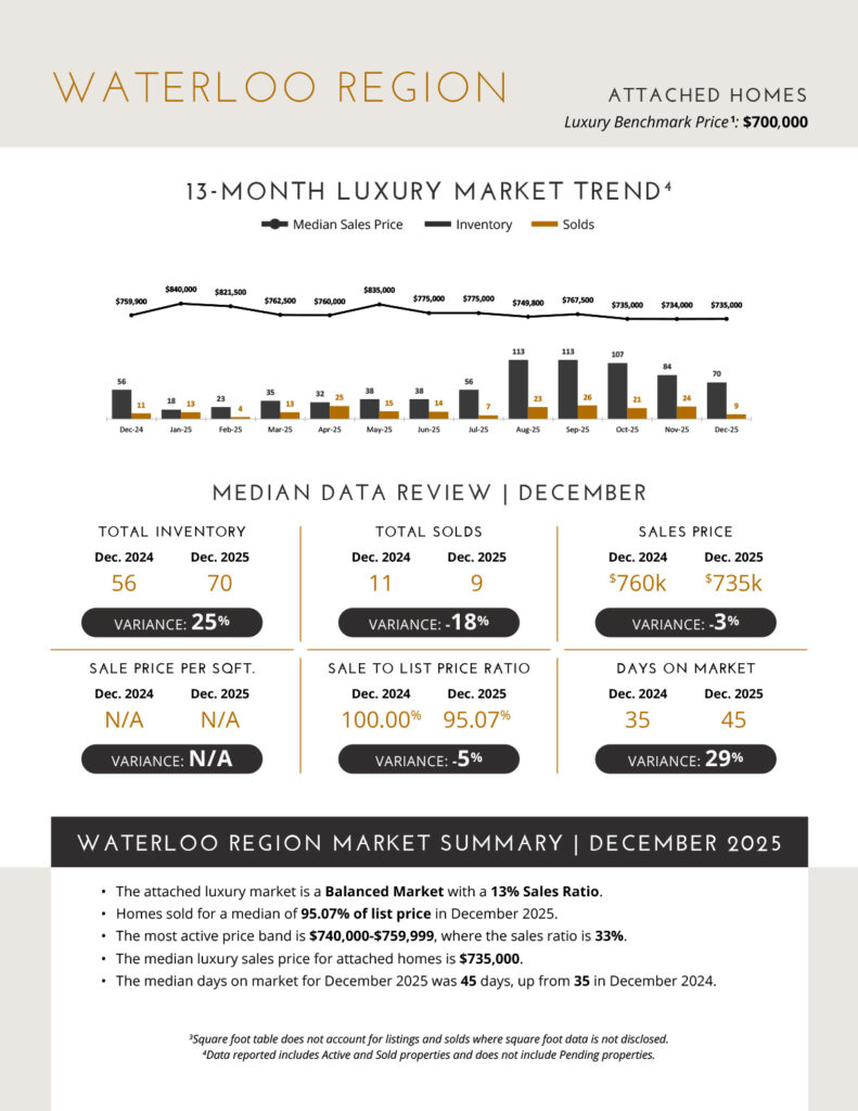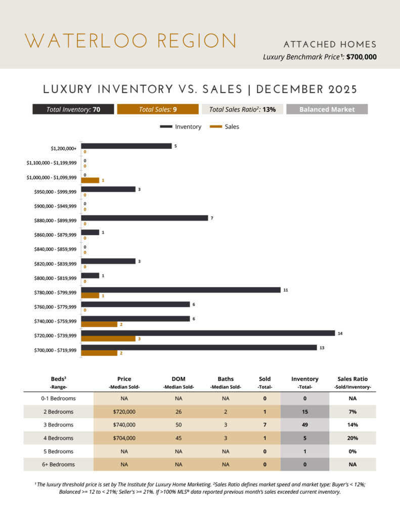 The attached luxury segment in Waterloo Region is trending more balanced, offering opportunity on both sides of the transaction.